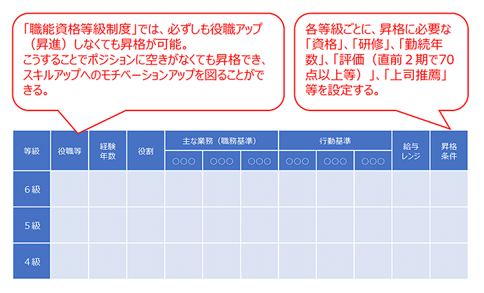 等級制度は、職員の成長ステップを明示する仕組みです。「次にどんなスキルを身につければ昇格できるのか」が明確になることで、職員は将来像を描きやすくなります。