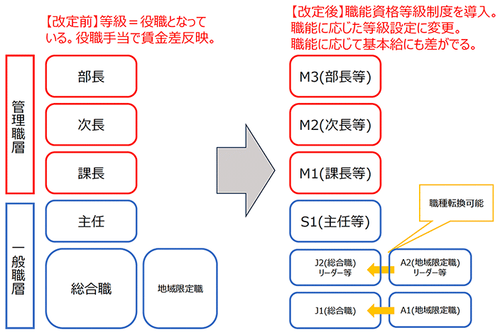 ※補足:役職=等級とする運用では、役職ポストに空きがない場合は昇格できず、この状態が継続するとモチベーションが低下するため、例えば、「職能資格等級制度」を導入すると、役職に就いていなくてもスキルに応じて等級が上がる仕組みが作れます。こちらの(図表5:「職能資格等級制度」への移行フレーム(執筆者作成))でイメージを確認いただければと思います。