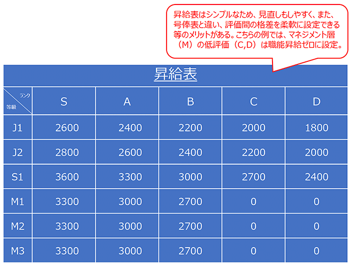 等級・評価との連動では「評価して終わり」にならず、給与・賞与への反映まで一貫して行うことが重要です。連動のさせ方としては、例えば、昇給の要素を、①年齢(勤続年数)、②毎年の評価、③昇格時の昇給、の3つに分けて、それぞれの配分を各事業所の方針によって考えてゆく、等があります。「②毎年の評価」の反映に関しては、例えば、(図表7:昇給表(執筆者作成))のような昇給表を用いて、各等級・各評価ごとに昇給額を設定してゆくとシンプルで分かりやすいです。