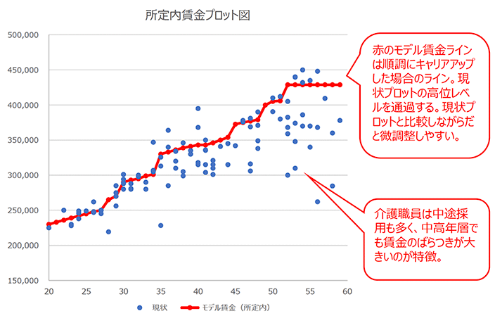 一例として、上記のようにメリハリを持たせた賃金制度に改定した場合の賃金推移をグラフで表したものが(図表8:モデル賃金ラインと賃金プロット図(執筆者作成))の赤いラインとなります。このラインは、入社後、比較的順調に昇格を繰り返して賃金アップをしてきた職員を想定しております。